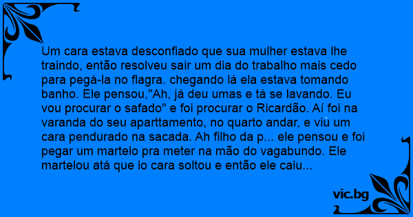 Um cara estava desconfiado que sua mulher estava lhe traindo, então resolveu sair um dia do trabalho mais cedo para pegá-la no flagra. chegando lá ela estava tomando banho. Ele pensou,"Ah, já deu umas e tá se lavando. Eu vou procurar o safado" e foi procurar o Ricardão. Aí foi na varanda do seu aparttamento, no quarto andar, e viu um cara pendurado na sacada. Ah filho da p... ele pensou e foi pegar um martelo pra meter na mão do vаgавundо. Ele martelou atá que io cara soltou e então ele caiu numa árvore lá embaixo, mas nào morreu, só tinha machucado. Então o cornudo pegou uma geladeira velha e taca no cara, que morre. Aí o соrnо arrendido pensa:
