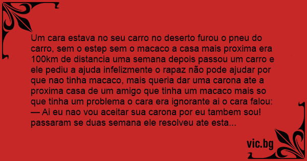 Um cara estava no seu carro no deserto furou o pneu do carro, sem o estep sem o macaco a casa mais proxima era 100km de distancia uma semana depois passou um carro e ele pediu a ajuda infelizmente o rapaz não pode ajudar por que nao tinha macaco, mais queria dar uma carona ate a proxima casa de um amigo que tinha um macaco mais so que tinha um problema o cara era ignorante ai o cara falou: