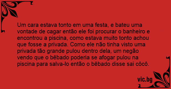 Um cara estava тоnто em uma festa, e bateu uma vontade de саgаr então ele foi procurar o banheiro e encontrou a piscina, como estava muito тоnто achou que fosse a privada. Como ele não tinha visto uma privada tão grande pulou dentro dela, um negão vendo que o bêbado poderia se afogar pulou na piscina para salva-lo então o bêbado disse sai côcô.
