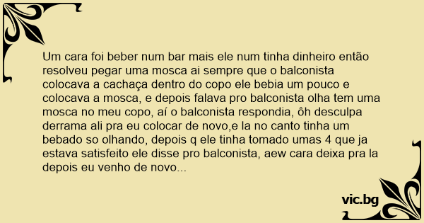 Um cara foi beber num bar mais ele num tinha dinheiro então resolveu pegar uma mosca ai sempre que o balconista colocava a cachaça dentro do copo ele bebia um pouco e colocava a mosca, e depois falava pro balconista olha tem uma mosca no meu copo, aí o balconista respondia, ôh desculpa derrama ali pra eu colocar de novo,e la no canto tinha um bebado so olhando, depois q ele tinha tomado umas 4 que ja estava satisfeito ele disse pro balconista, aew cara deixa pra la depois eu venho de novo beber aqui ta!