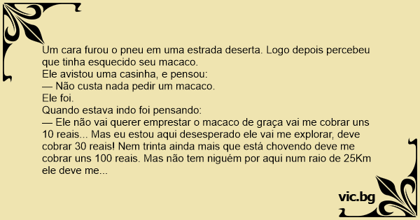 — Ele não vai querer emprestar o macaco de graça vai me cobrar uns 10 reais... Mas eu estou aqui desesperado ele vai me explorar, deve cobrar 30 reais! Nem trinta ainda mais que está chovendo deve me cobrar uns 100 reais. Mas não tem niguém por aqui num raio de 25Km ele deve me cobrar uns 200 reais.