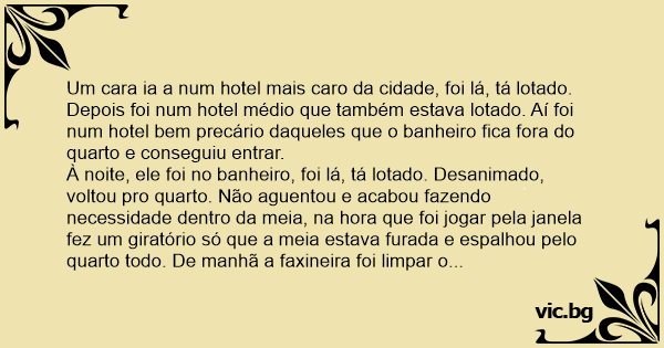 Um cara ia a num hotel mais caro da cidade, foi lá, tá lotado. Depois foi num hotel médio que também estava lotado. Aí foi num hotel bem precário daqueles que o banheiro fiса fora do quarto e conseguiu entrar.