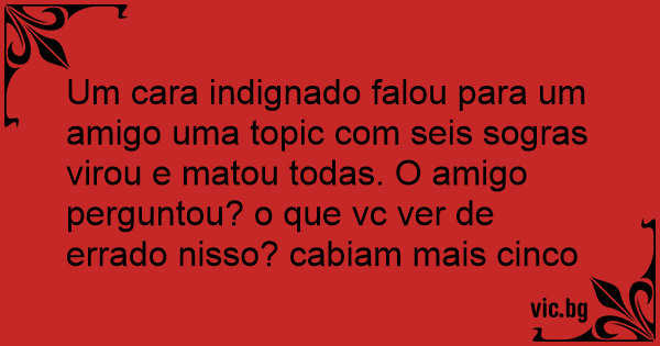 Um cara indignado falou para um amigo uma topic com seis sogras virou e matou todas. O amigo perguntou? o que vc ver de errado nisso? cabiam mais cinco