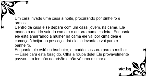 Et ægtepar bliver overrumplet at en indbrudstyv. Han binder dem til sengen og bøjer sig ned og kysser kvinden på kinden. Derefter går han ud på badeværelset. Manden siger til konen: Jeg så godt han...