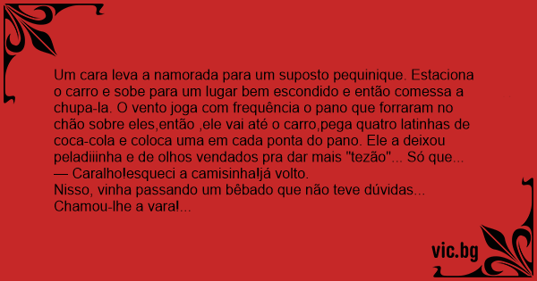 Um cara leva a namorada para um suposto pequinique. Estaciona o carro e sobe para um lugar bem escondido e então comessa a chupa-la. O vento joga com frequência o pano que forraram no chão sobre eles,então ,ele vai até o carro,pega quatro latinhas de coca-cola e coloca uma em cada ponta do pano. Ele a deixou peladiiinha e de olhos vendados pra dar mais "tezão"... Só que...