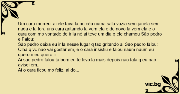 Um cara morreu, ai ele tava la no céu numa sala vazia sem janela sem nada e la fora uns cara gritamdo la vem ela e de novo la vem ela e o cara com mo vontade de ir la né ai teve um dia q ele chamou São pedro e Falou: