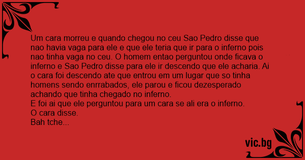 Um cara morreu e quando chegou no ceu Sao Pedro disse que nao havia vaga para ele e que ele teria que ir para o inferno pois nao tinha vaga no ceu. O homem entao perguntou onde ficava o inferno e Sao Pedro disse para ele ir descendo que ele acharia. Ai o cara foi descendo ate que entrou em um lugar que so tinha homens sendo enrrabados, ele parou e ficou dezesperado achando que tinha chegado no inferno.
