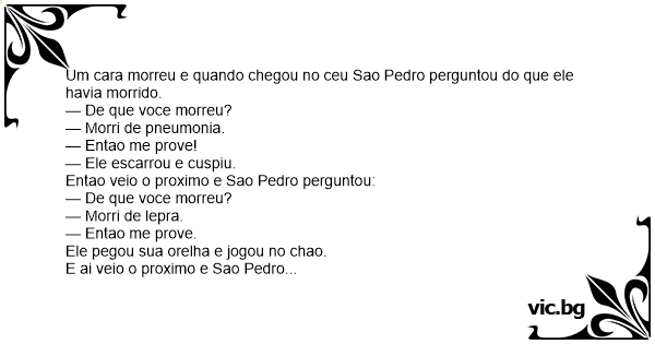 Um cara morreu e quando chegou no ceu Sao Pedro perguntou do que ele havia morrido.