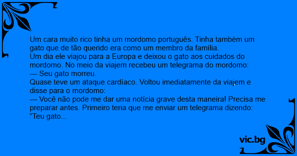 Um cara muito rico tinha um mordomo português. Tinha também um gato que de tão querido era como um membro da família.
