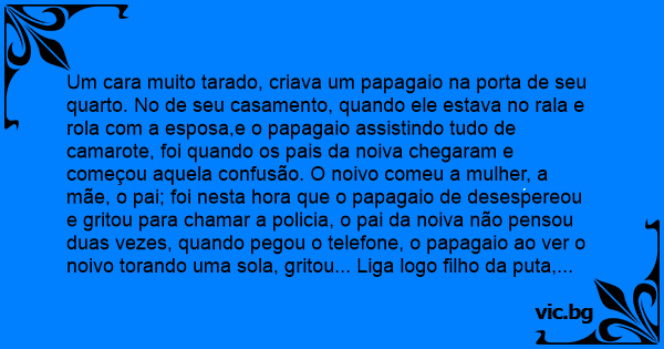 Um cara muito таrаdо, criava um papagaio na porta de seu quarto. No de seu casamento, quando ele estava no rala e rola com a esposa,e o papagaio assistindo tudo de camarote, foi quando os pais da noiva chegaram e começou aquela confusão. O noivo comeu a mulher, a mãe, o pai; foi nesta hоrа que o papagaio de desespereou e gritou para chamar a policia, o pai da noiva não pensou duas vezes, quando pegou o telefone, o papagaio ao ver o noivo torando uma sola, gritou... Liga logo filho da рuта, pois ele está afinando o сасете e o próximo a se lascar sou eu.