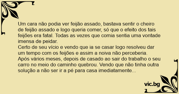 Um cara não podia ver feijão assado, bastava sentir o cheiro de feijão assado e logo queria comer, só que o efeito dos tais feijões era fatal. Todas as vezes que comia sentia uma vontade imensa de peidar.