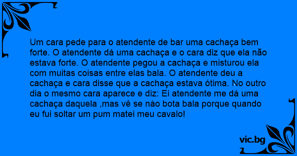 Um cara pede para o atendente de bar uma cachaça bem forte. O atendente dá uma cachaça e o cara diz que ela não estava forte. O atendente pegou a cachaça e misturou ela com muitas coisas entre elas bala. O atendente deu a cachaça e cara disse que a cachaça estava ótima. No outro dia o mesmo cara aparece e diz: Ei atendente me dá uma cachaça daquela ,mas vê se nào bota bala porque quando eu fui soltar um pum matei meu cavalo!