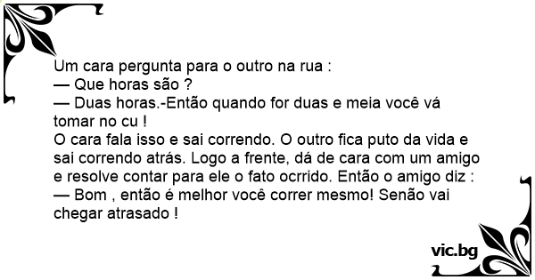 O cara fala isso e sai correndo. O outro fiса рuто da vida e sai correndo atrás. Logo a frente, dá de cara com um amigo e resolve contar para ele o fato ocrrido. Então o amigo diz :