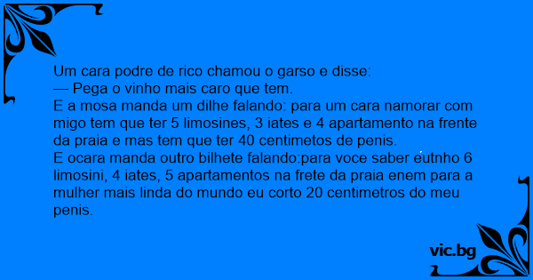 E ocara manda outro bilhete falando:para voce saber eutnho 6 limosini, 4 iates, 5 apartamentos na frete da praia enem para a mulher mais linda do mundo eu corto 20 centimetros do meu реnis.