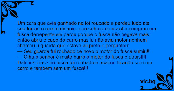 Um cara que avia ganhado na foi roubado e perdeu tudo até sua ferrari e com o dinheiro que sobrou do assalto comprou um fusca derrepente ele parou porque o fusca não pegava mais então abriu o capo do carro mas la não avia motor nenhum chamou u guarda que estava ali preto e perguntou: