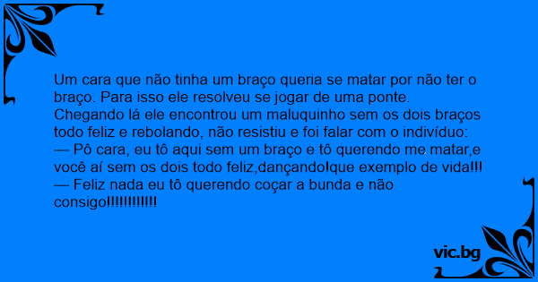 Um cara que não tinha um braço queria se matar por não ter o braço. Para isso ele resolveu se jogar de uma ponte. Chegando lá ele encontrou um maluquinho sem os dois braços todo feliz e rebolando, não resistiu e foi falar com o indivíduo: