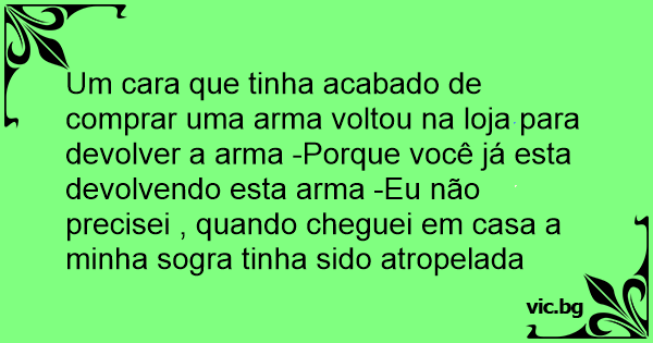 Um cara que tinha acabado de comprar uma arma voltou na loja para devolver a arma -Porque você já esta devolvendo esta arma -Eu não precisei , quando cheguei em casa a minha sogra tinha sido atropelada