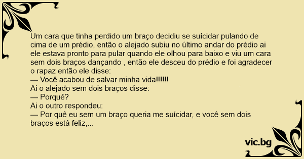 Um cara que tinha perdido um braço decidiu se suícidar pulando de cima de um prédio, então o alejado subiu no último andar do prédio ai ele estava pronto para pular quando ele olhou para baixo e viu um cara sem dois braços dançando , então ele desceu do prédio e foi agradecer o rapaz então ele disse: