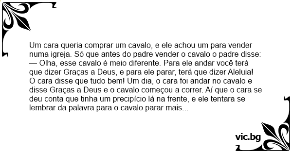 Um cara queria comprar um cavalo, e ele achou um para vender numa igreja. Só que antes do padre vender o cavalo o padre disse: