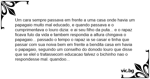 Um cara sempre passava em frente a uma casa onde havia um papagaio muito mal educado, e quando passava e o cumprimentava o louro dizia: e ai seu filho da рuта... e o rapaz ficava fulo da vida e tambem respondia a altura chingava o papagaio... passado o tempo o rapaz ia se casar e tinha que passar com sua noiva bem em frente a bendita casa em havia o papagaio, seguindo um conselho do donodo louro que disse que se elel o tratassecom educacao talvez o bichinho nao o respondesse mal. quandoo rapaz passou comsua noiva em frente a casa olhou para o verdinho e disse: ola louro muito bom dia!! e opapagaio рuто responde: até que enfim aprendeu né filho da рuта!!!!!!!!!!!