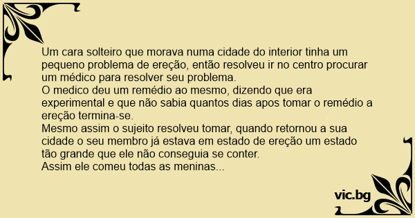 Mesmo assim o sujeito resolveu tomar, quando retornou a sua cidade o seu membro já estava em estado de ereção um estado tão grande que ele não conseguia se conter.