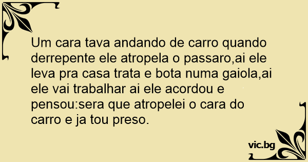 Um cara tava andando de carro quando derrepente ele atropela o passaro,ai ele leva pra casa trata e bota numa gaiola,ai ele vai trabalhar ai ele acordou e pensou:sera que atropelei o cara do carro e ja tou preso.