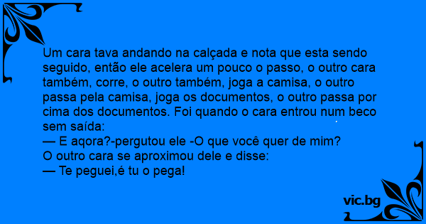 Um cara tava andando na calçada e nota que esta sendo seguido, então ele acelera um pouco o passo, o outro cara também, corre, o outro também, joga a camisa, o outro passa pela camisa, joga os documentos, o outro passa por cima dos documentos. Foi quando o cara entrou num beco sem saída: