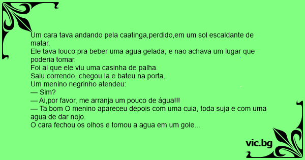 — Ta bom O menino apareceu depois com uma cuia, toda suja e com uma agua de dar nojo.