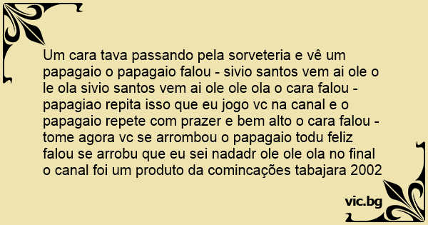 Um cara tava passando pela sorveteria e vê um papagaio o papagaio falou - sivio santos vem ai ole o le ola sivio santos vem ai ole ole ola o cara falou - papagiao repita isso que eu jogo vc na canal e o papagaio repete com prazer e bem alto o cara falou - tome agora vc se arrombou o papagaio todu feliz falou se arrobu que eu sei nadadr ole ole ola no final o canal foi um produto da comincações tabajara 2002