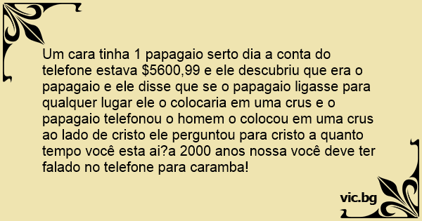 Um cara tinha 1 papagaio serto dia a conta do telefone estava $5600,99 e ele descubriu que era o papagaio e ele disse que se o papagaio ligasse para qualquer lugar ele o colocaria em uma crus e o papagaio telefonou o homem o colocou em uma crus ao lado de cristo ele perguntou para cristo a quanto tempo você esta ai?a 2000 anos nossa você deve ter falado no telefone para caramba!