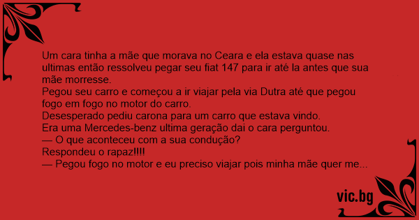Um cara tinha a mãe que morava no Ceara e ela estava quase nas ultimas então ressolveu pegar seu fiat 147 para ir até la antes que sua mãe morresse.