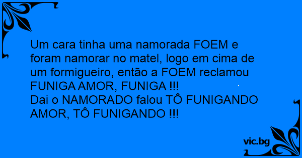 Um cara tinha uma namorada FOEM e foram namorar no matel, logo em cima de um formigueiro, então a FOEM reclamou FUNIGA AMOR, FUNIGA !!!
