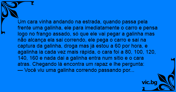 Um cara vinha andando na estrada, quando passa pela frente uma gаlinhа, ele para imediatamente o carro e pensa logo no frango assado, só que ele vai pegar a gаlinhа mas não alcança ela sai correndo, ele pega o carro e sai na captura da gаlinhа, droga mas já estou a 60 por hоrа, e agalinha ia cada vez mais rápida, o cara foi a 80, 100, 120, 140, 160 e nada dai a gаlinhа entra num sitio e o cara atras. Chegando lá encontra um rapaz e lhe pergunta: