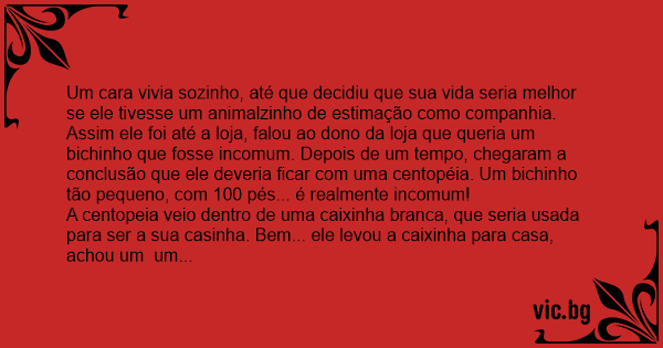 Um cara vivia sozinho, até que decidiu que sua vida seria melhor se ele tivesse um animalzinho de estimação como companhia. Assim ele foi até a loja, falou ao dono da loja que queria um bichinho que fosse incomum. Depois de um tempo, chegaram a conclusão que ele deveria ficar com uma centopéia. Um bichinho tão pequeno, com 100 pés... é realmente incomum!