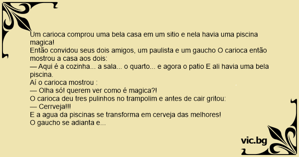 Então convidou seus dois amigos, um paulista e um gaucho O carioca então mostrou a casa aos dois: