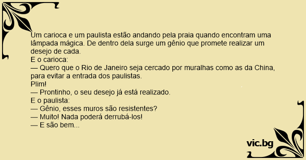 — Quero que o Rio de Janeiro seja cercado por muralhas como as da China, para evitar a entrada dos paulistas.