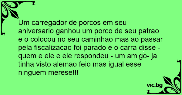 Um carregador de porcos em seu aniversario ganhou um роrсо de seu patrao e o colocou no seu caminhao mas ao passar pela fiscalizacao foi parado e o carra disse -quem e ele e ele respondeu - um amigo- ja tinha visto alemao feio mas igual esse ninguem merese!!!