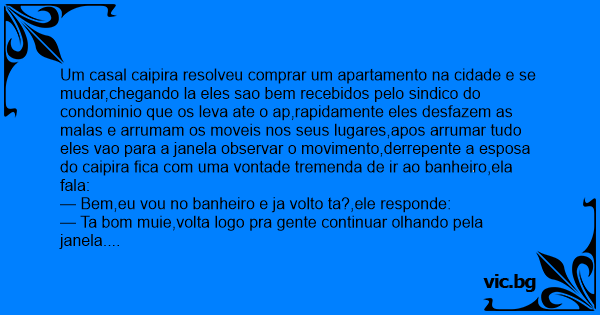 — Oia so,minha muie foi usar o vaso e como e gordinha acabo ficando intalada,o que o senhor pode fazer? pergunta o caipira,o sindico olha bem a mulher ali nua entalada no vaso so com um capacete tampando a parte intima dela e responde: