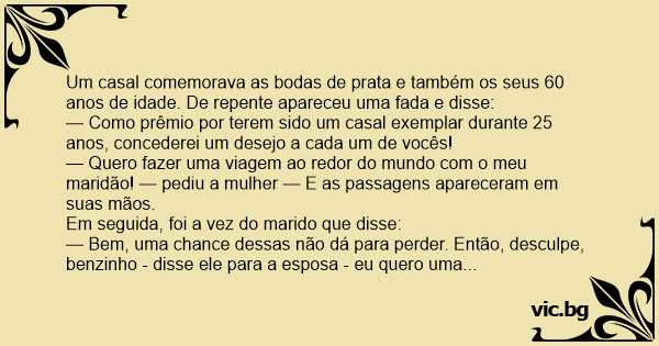 — Como prêmio por terem sido um casal exemplar durante 25 anos, concederei um desejo a cada um de vocês!