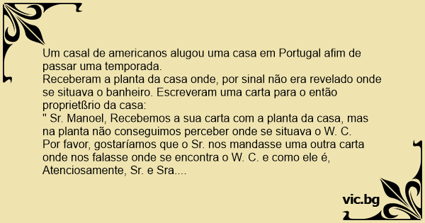 O português recebeu a carta e respondeu achando que W. C. era o nome da Igreja que existe em Portugal chamada "WATHER CLOSE".