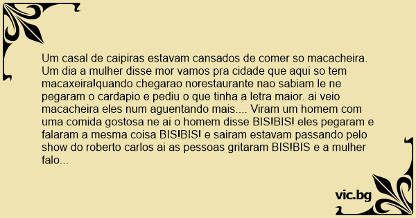 Um dia a mulher disse mor vamos pra cidade que aqui so tem macaxeira!quando chegarao norestaurante nao sabiam le ne pegaram o cardapio e pediu o que tinha a letra maior. ai veio macacheira eles num aguentando mais.... Viram um homem com uma comida gostosa ne ai o homem disse BIS!BIS! eles pegaram e falaram a mesma coisa BIS!BIS! e sairam estavam passando pelo show do roberto carlos ai as pessoas gritaram BIS!BIS e a mulher falo corre mo que la vem macaxeira