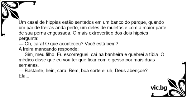 Um casal de hippies estão sentados em um banco do parque, quando um par de freiras anda perto, um deles de muletas e com a maior parte de sua perna engessada. O mais extrovertido dos dois hippies pergunta: