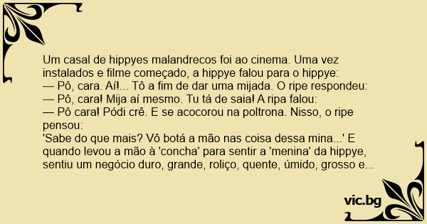 'Sabe do que mais? Vô botá a mão nas coisa dessa mina...' E quando levou a mão à 'concha' para sentir a 'menina' da hippye, sentiu um negócio durо, grande, roliço, quente, úmido, grosso e durо. Imediatamente, perguntou: