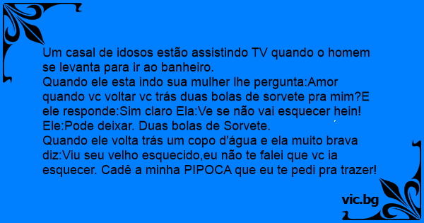 Quando ele volta trás um copo d'água e ela muito brava diz:Viu seu velho esquecido,eu não te falei que vc ia esquecer. Cadê a minha PIPOCA que eu te pedi pra trazer!