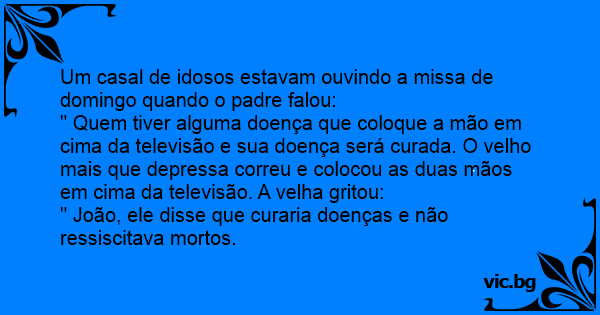 O casal de velhinhos estava ouvindo um programa religioso pelo rádio. Era um daqueles pastores que prometem curas milagrosas, manja? Com sua voz retumbante, ele dizia: — Coloque uma mão no rádio e...