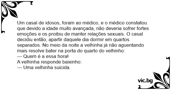 Um casal de idosos, foram ao médico, e o médico constatou que devido a idade muito avançada, não deveria sofrer fortes emoções e os proibiu de manter relações sexuais. O casal decidiu então, apartir daquele dia dormir em quartos separados. No meio da noite a velhinha já não aguentando mais resolve bater na porta do quarto do velhinho: