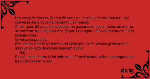 Um casal de idosos, já com 50 anos de casados resolveram ter uma conversa séria. A velha perguntou ao marido: