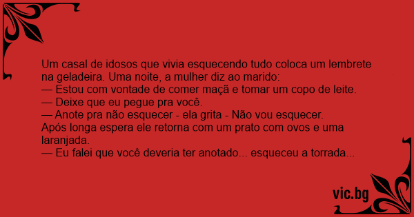 Um casal de idosos que vivia esquecendo tudo coloca um lembrete na geladeira. Uma noite, a mulher diz ao marido: