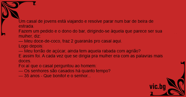 — Meu doce-de-coco, traz 2 guaranás pro casal aqui.