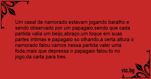 Um casal de namorado estavam jogando baralho e sendo observado por um papagaio,sendo que cada partida valia um beijo,abraço,um toque em suas partes intimas e papagaio so olhando,a certa altura o namorado falou:vamos nessa partida valer uma fоdа,mais que depressa o papagaio falou:to no jogo,da carta para tres.